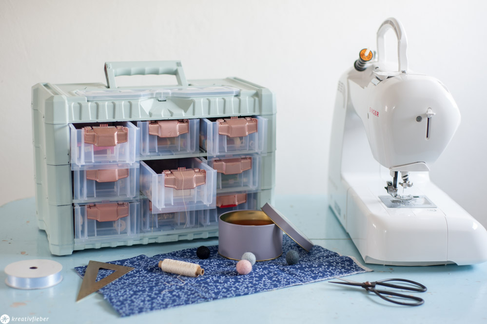Hässliche, aber praktische Sortimentskästen* für Schrauben und Co. aus dem Baumarkt lassen sich prima für Bastelsachen umfunktionieren. Ein bisschen Sprühfarbe und schon sieht das Ganze auch gleich viel hübscher aus. Schaut euch den Artikel dazu hier an. Es gibt Ausführungen mit unterschiedlich großen Fächern und sogar stapelbare Türme, sollte die Materialsammlung wachsen.
