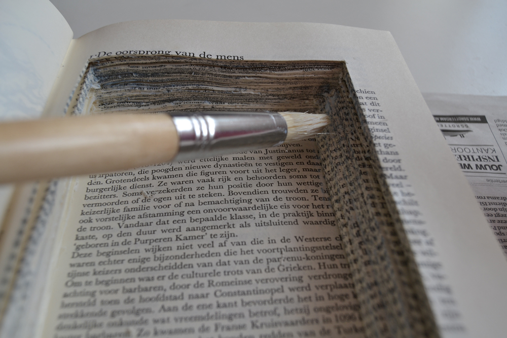Wenn ihr fertig seid, könnt ihr die Innen- und Außenseiten von dem Geheimfach mit Dekopatsch-Kleister einschmieren. Dann kleben diese aneinander und werden hart. Die restlichen Seiten hab ich bei meinem Buch ausgelassen. Die sind jetzt nämlich noch einfach zu blättern wie ein normales Buch. Achtet nur drauf, dass ihr dann einen halben Zentimeter Seiten als “Boden” des Faches auch festkleistert.