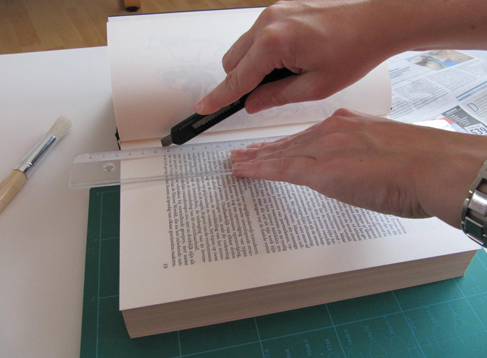 Je nachdem was ihr darin verstecken wollt, solltet ihr die Tiefe des Faches wählen. Damit ihr nicht zu weit schneidet, legt ihr am besten eine Schneideunterlage zwischen die letzte Seite vom Fach und den Rest.