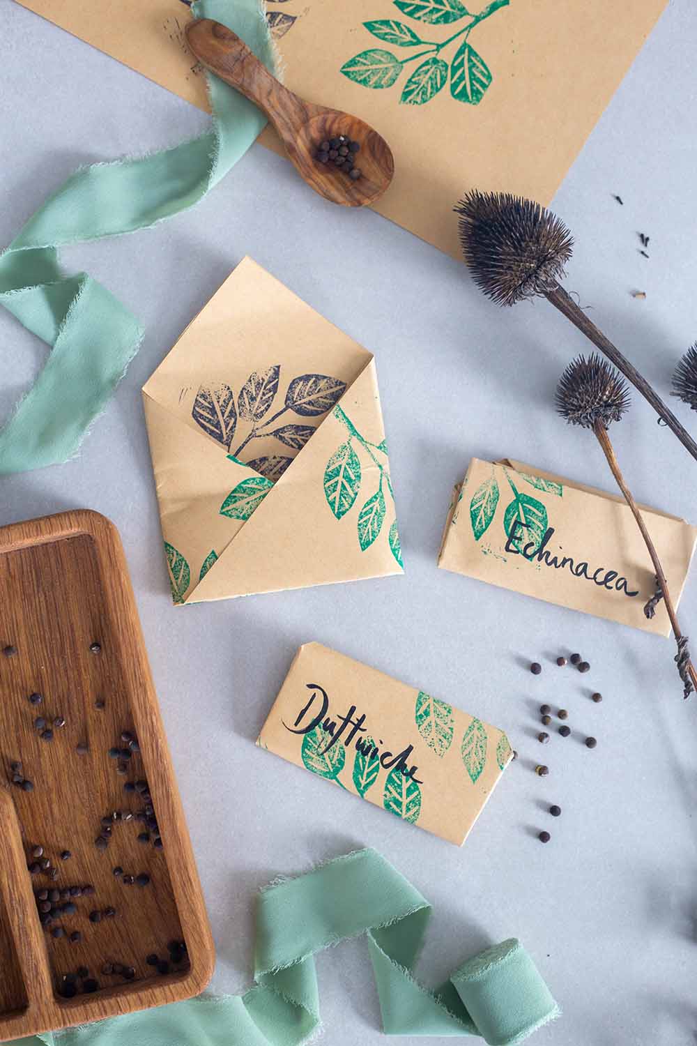 Ich habe zuvor ein 50er Set einfache Papiertütchen genutzt (unten bei den Gartenfavoriten verlinkt), aber da ich viel Saatgut verschenke, habe ich dieses schnell aufgebraucht. Jetzt falte ich die kleinen Saattütchen einfach selbst aus Altpapier. So könnt ihr sie übrigens auch perfekt spontan verschenken oder Freundinnen mitgegeben. Oder eure Origami- oder Scrapbookpapiersammlung verkleinern! Falls ihr ganz gezielt schöne Blumensamentütchen zum Verschenken herstellen möchtet, könnt ihr zum Beispiel dieses florale Origamipapier dafür nutzen. Ich habe zum Verschenken einfach Kraftpapier mit einem selbstgeschnitzten Stempel verziert.