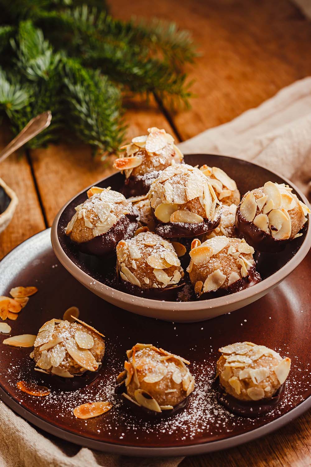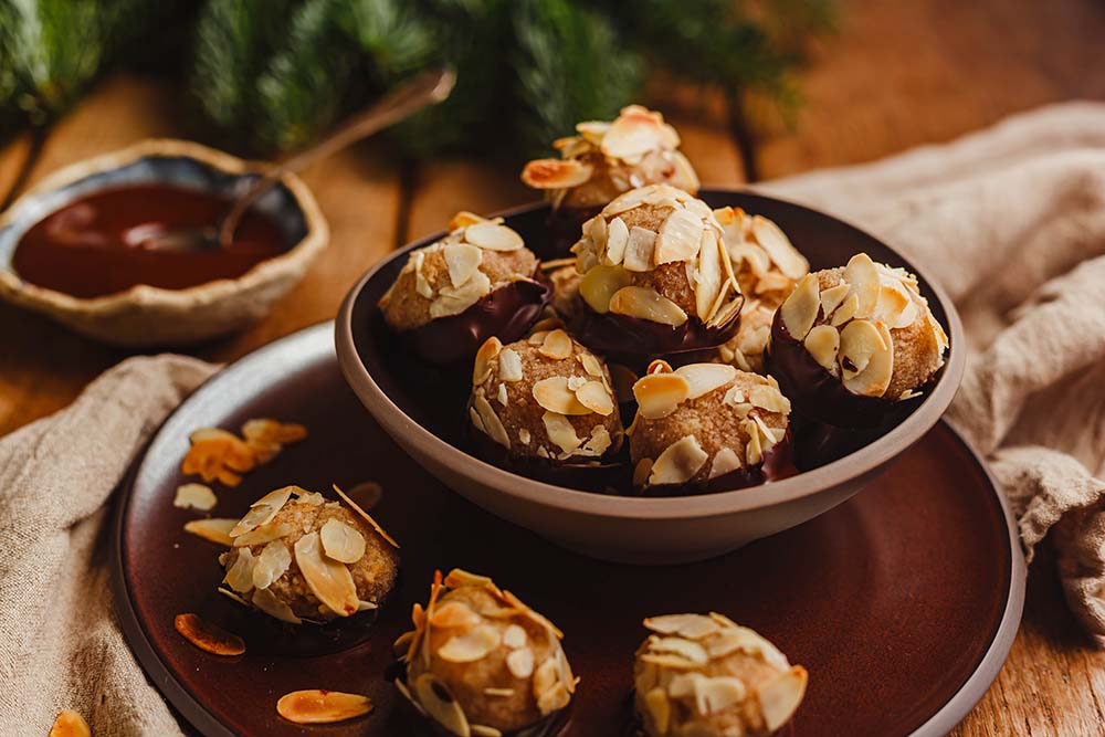 - Feuchtet die Hände leicht mit Wasser an und formt ca. 25 Kugeln aus dem Teig. Rollt diese durch die Mandelblättchen und setzt sie auf ein Backblech mit Backpapier.