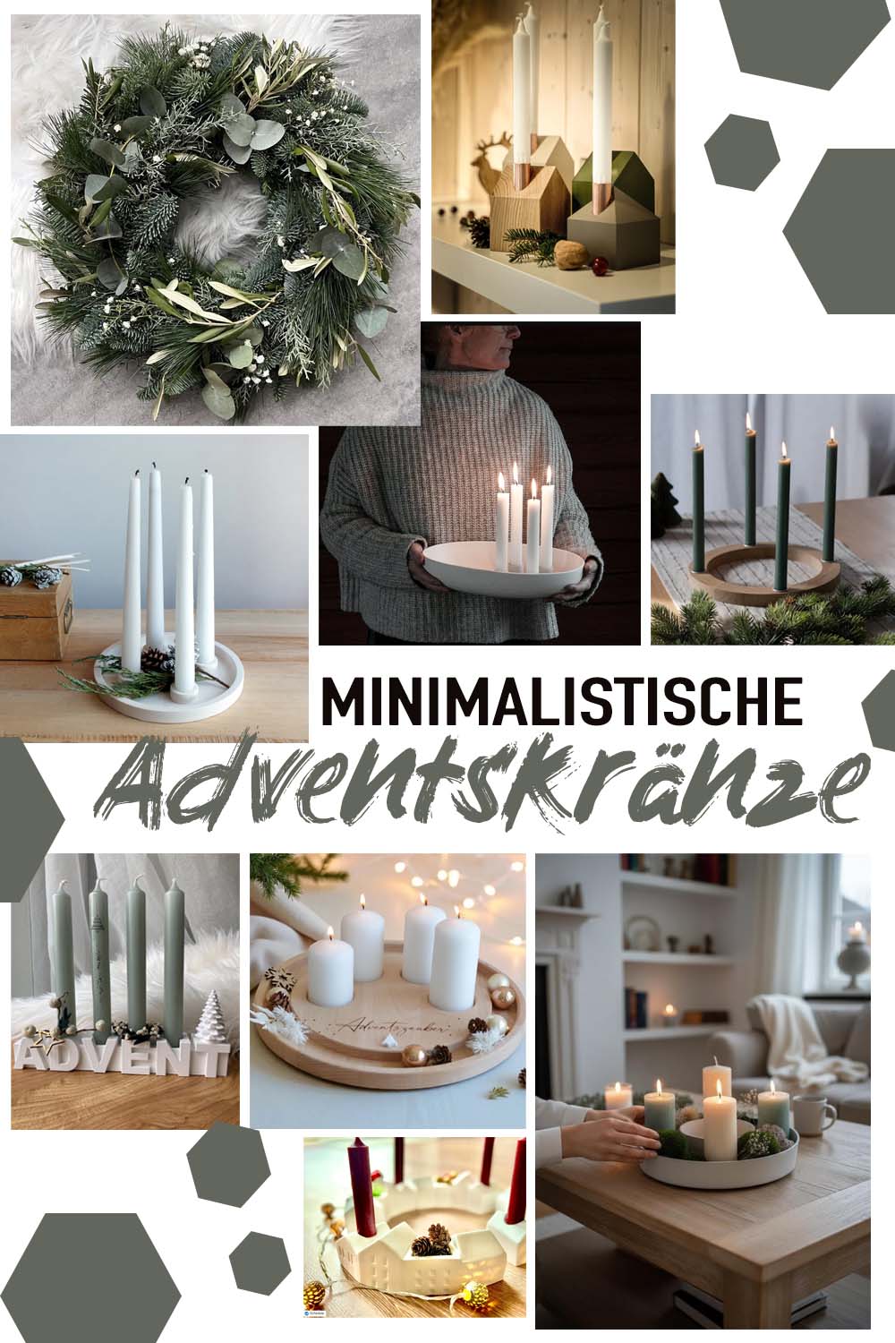 Meine Sammlung habe ich euch wie immer als Collage zusammengestellt. Manchmal müsst ihr euch die Deko auf den Bildern etwas wegdenken, damit ihr einen wirklich minimalistischen Adventskranz erhaltet. Generell sind aber alle Ideen schöne Basisteile, die auch in ganz schlicht ohne Deko nur mit Kerzen wunderbar funktionieren. Das Schöne finde ich, dass ihr sie jedes Jahr neu dekorieren könnt.