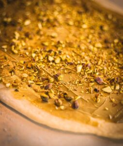 - Nach der Gehzeit noch einmal durchkneten und zu einem Rechteck ausrollen (ca. 35×40 cm). Mit 175 g Pistaziencreme bestreichen. 50 g Pistazien grob hacken und darüber verteilen.