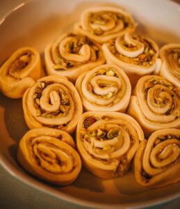 - Die Pistazienschnecken im vorgeheizten Backofen ca. 25 Minuten backen. Auskühlen lassen.