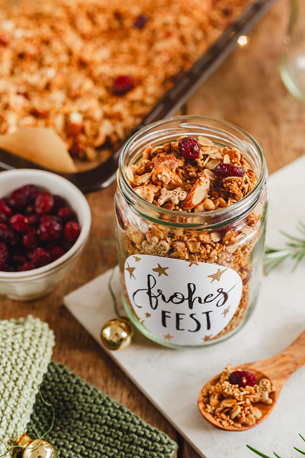 Heute habe ich endlich mal wieder eine Geschenkeidee aus der Küche für euch! Mit dem Rezept könnt ihr ganz einfach ein Weihnachtsmüsli selber machen und verschenken. Mit Spekulatiusgewürz, knackigen Nüssen, Cranberries und mini Lebkuchenkeksen!